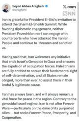 🔸ایران از دعوت رئیسجمهور السیسی برای حضور در نشست شرمالشیخ سپاسگزار است. با وجود تمایل به تعاملات دیپلماتیک، نه رئیسجمهور پزشکیان و نه من، نمیتوانیم با کسانی وارد تعامل شویم که به مردم ایران حمله کردهاند و همچنان ما را تهدید و تحریم میکنند.